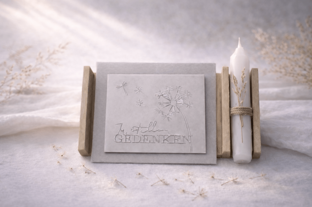 Jede Premium-Trauerkarte wird mit größter Sorgfalt in Handarbeit gefertigt. Das hochwertige Papier mit feiner Struktur, die besondere Gestaltung und der individuelle Klappmechanismus machen sie zu einem würdevollen Begleiter für stille Momente. Jede Karte wird einzeln geprüft und vermittelt Respekt, Nähe und ist ein stilles Zeichen der Verbundenheit.